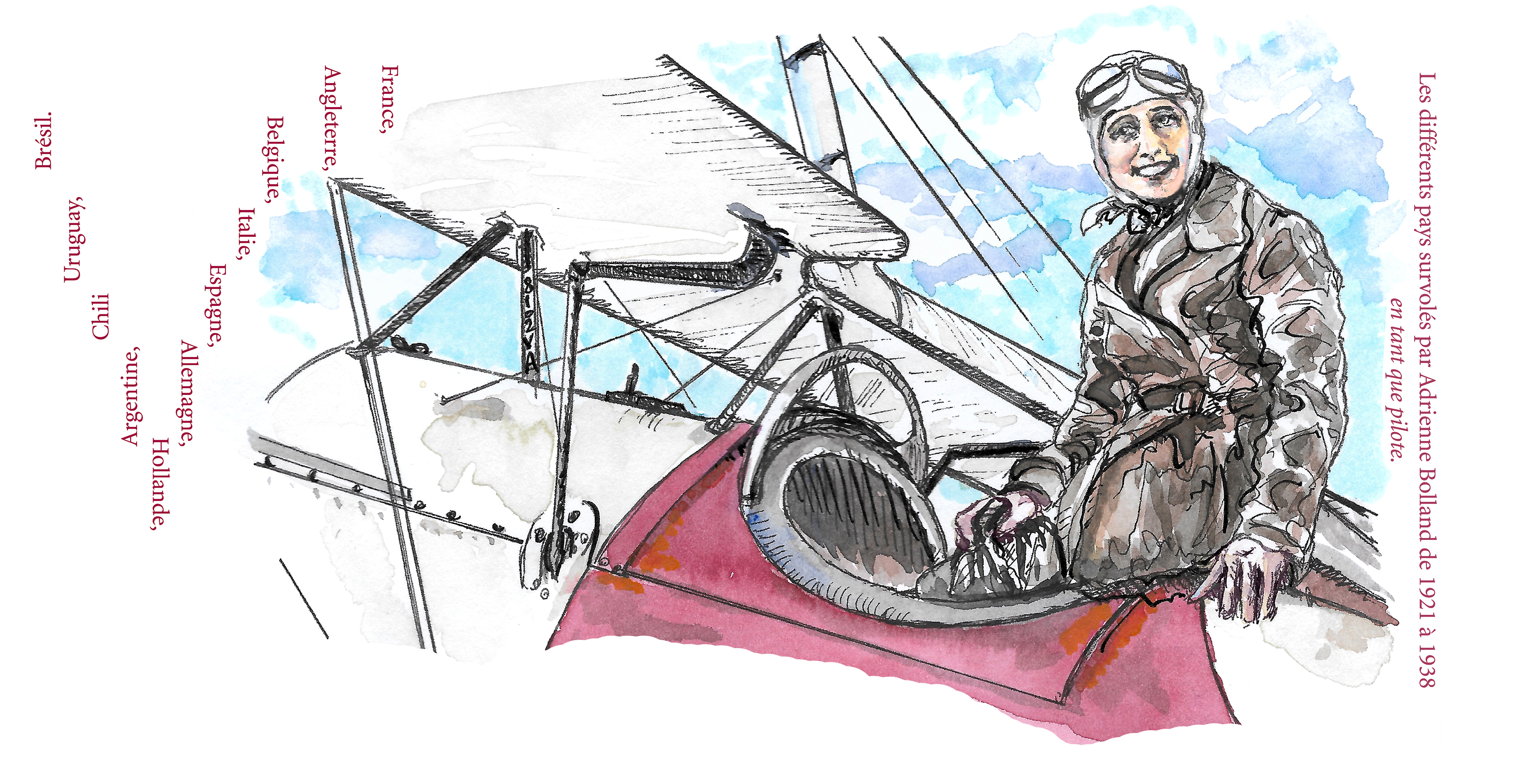 Carte Postale pédagogique. Adrienne Bolland dans son Morane de voltige en 1930. Les pays survolés par Adrienne Bolland