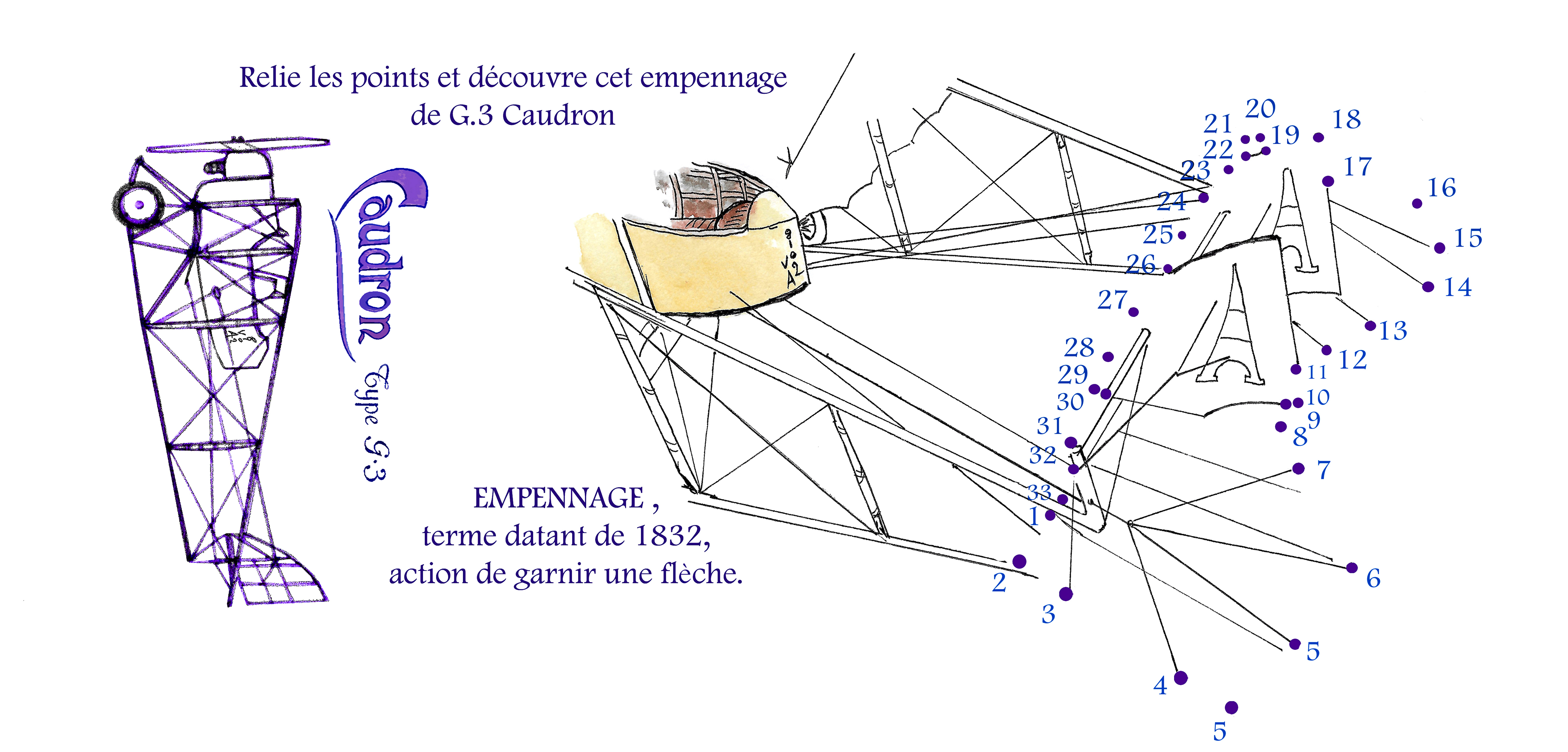 Carte Postale pédagogique, points à relier « L’empenage du G.3 Caudron ».