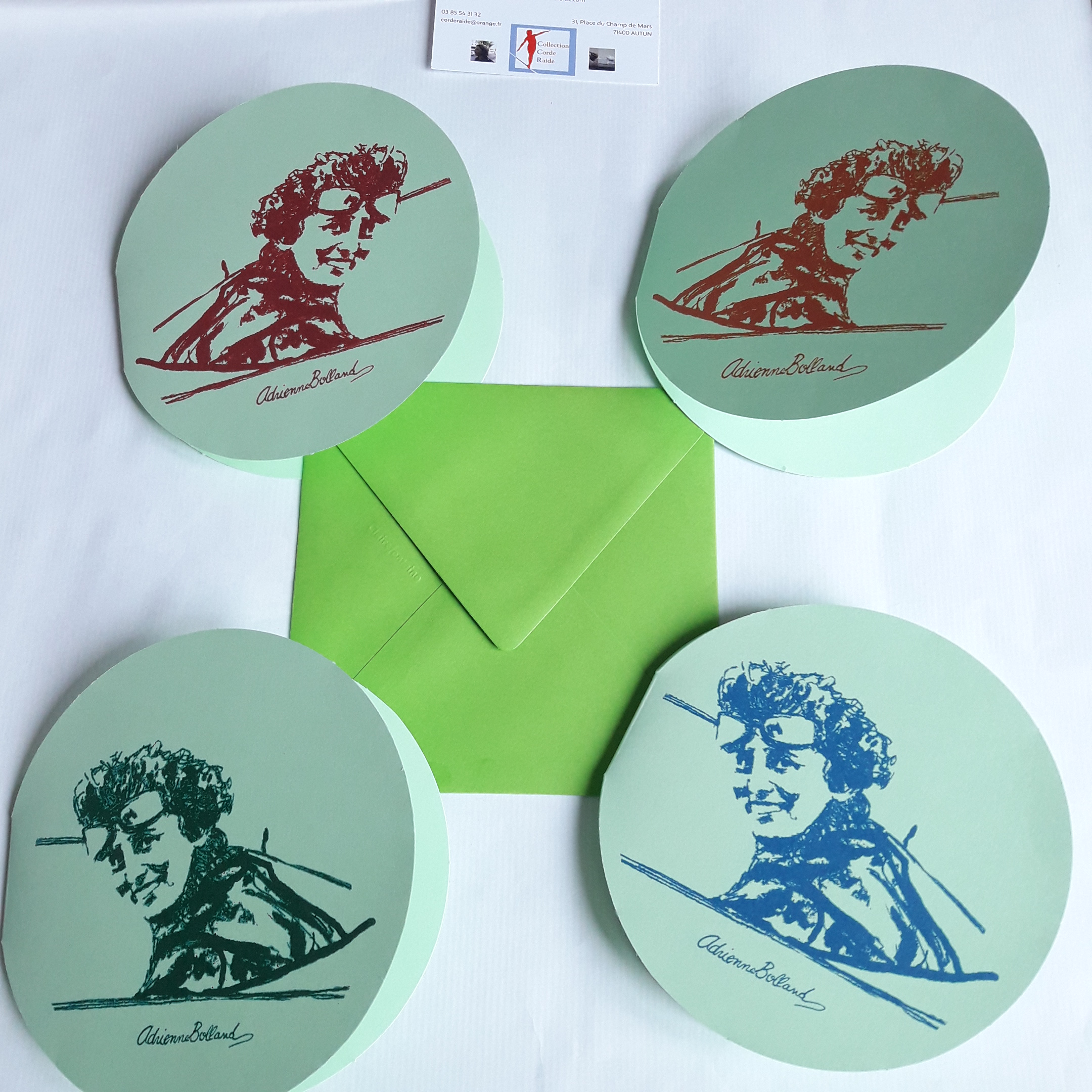 Carte postale ronde, double, avec enveloppe (12x12cm), 4 couleurs au choix, 8 €, envoi gratuit.